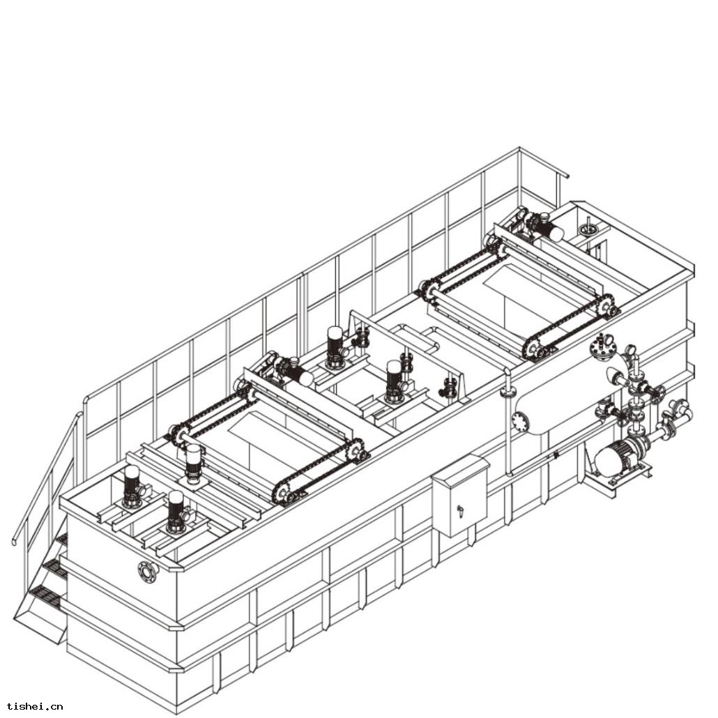 工業加工廢水(shuǐ)處理雙效(xiào)氣浮設備由池體 、渦凹曝氣機、溶氣系(xì)統、管路系(xì)統 、刮渣系(xì)統、電控系(xì)統 、走道爬梯組成(chéng)。